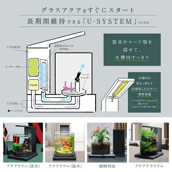 U-SYSTEM採用で器具やコード類をすっきり隠せて、水槽内すっきり。
