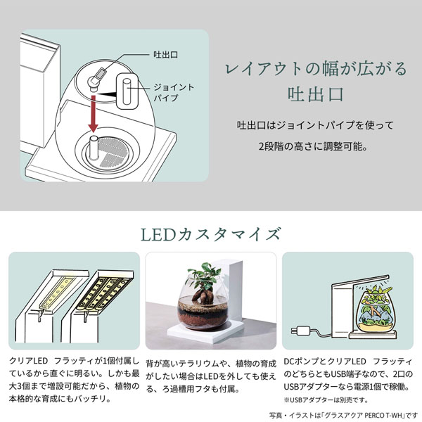 背が高いテラリウムや植物育成がしたい場合はLEDを外しても使えるろ過槽用フタも付属。