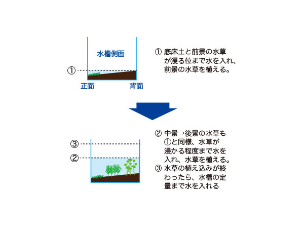 水槽の前側を低く、後ろ側が高く なるように傾斜をつけてると、奥行き感が出てレイアウトに効果的です。