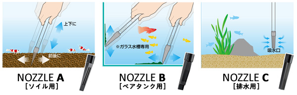 ソイル用、ベアタンク用、排水(水換え)用の3種ノズル交換式クリーナーです。