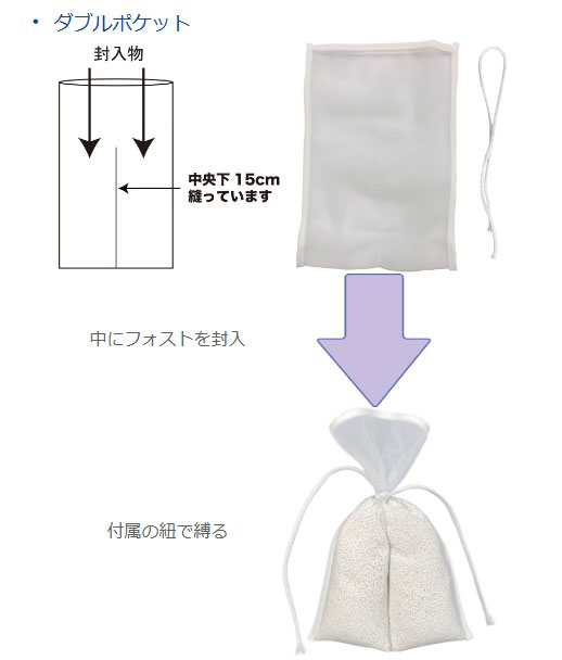 ダブルポケットタイプなので、従来のネットバックと比較し、同量の封入物を入れた時、