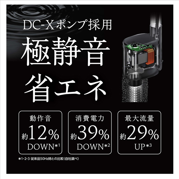 新開発DC-Xポンプ採用。ろ過性能UP、極めて静音&省エネ化。