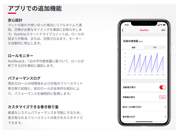 ReefMatには、不具合を未然に防ぐためのソリッドステート?デュアル水位センサーと、使用されるマットの正確な長さを制御および監視する、