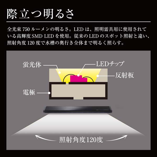 3色LEDが織りなす魚・水草・水の究極の美しさと際立つ明るさを楽しめます。