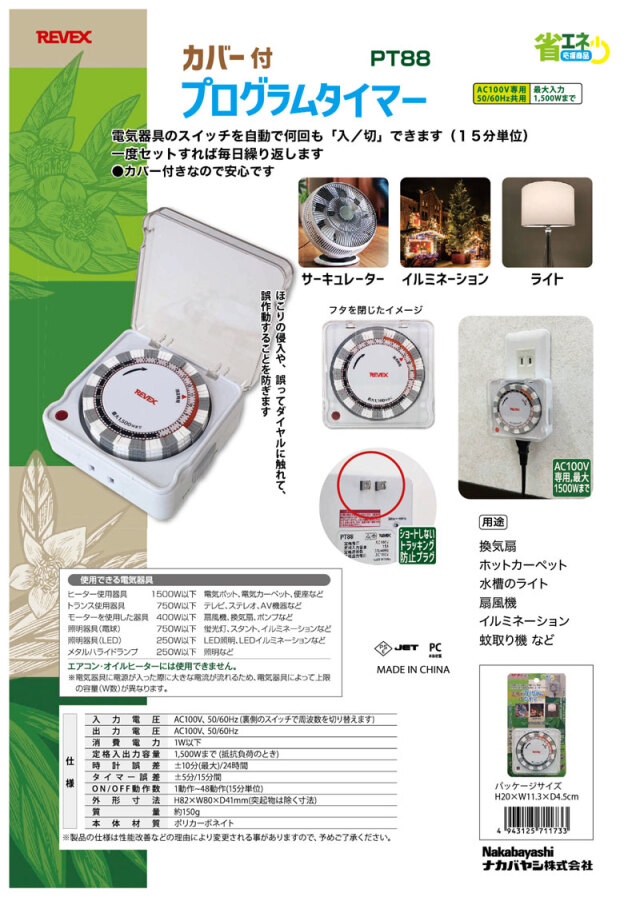 ・15分単位で何回でも、毎日自動的に電気器具の電源を「入・切」します(入り切り最大94動作)